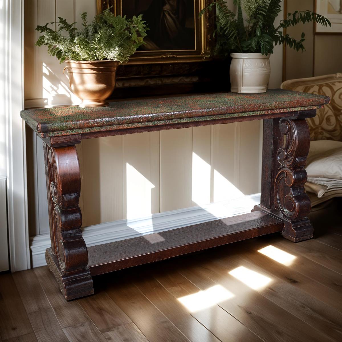 CREDENZA WITH HANDCARVED BASE LEGS AND GREEN COPPER TOP