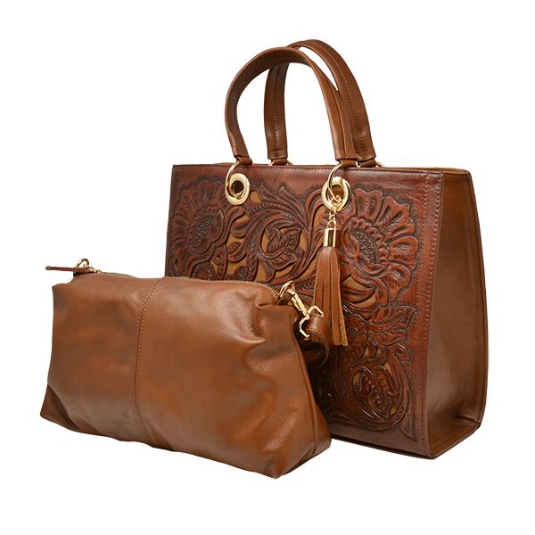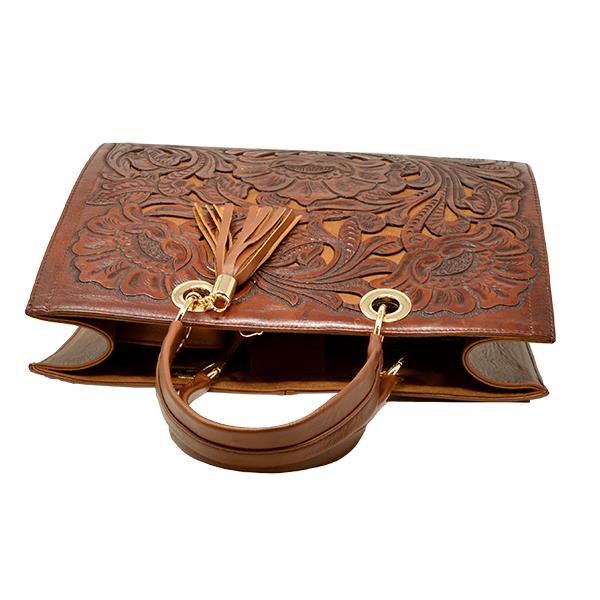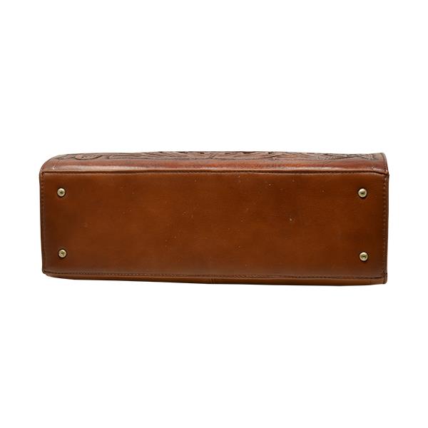 DALLAS TOOLED AND PERFORATED BAG W/ BONUS PURSE - BROWN 15" x 6" x 12 .5" HANDLE: 7" ...