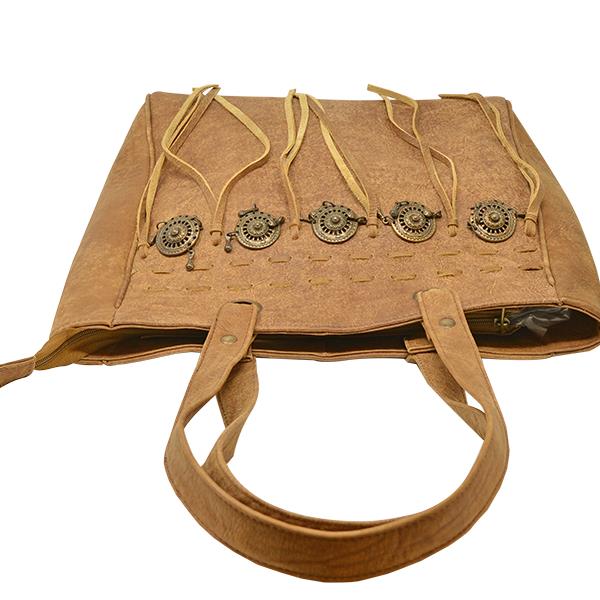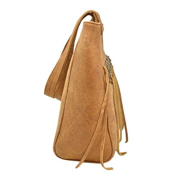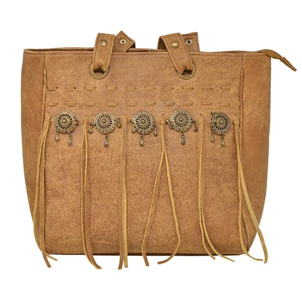 TAOS LEATHER SHOULDER BAG. LEATHER AND CONCHOS 15" x 5 .5" x 13" STRAP: 12"