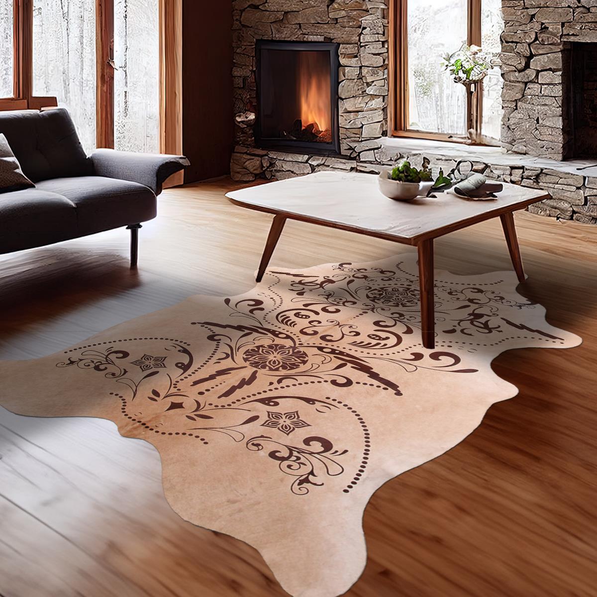 BAROQUE BROWN ON LIGHT BEIGE COWHIDE RUG - 2-3 SQM MEDIUM