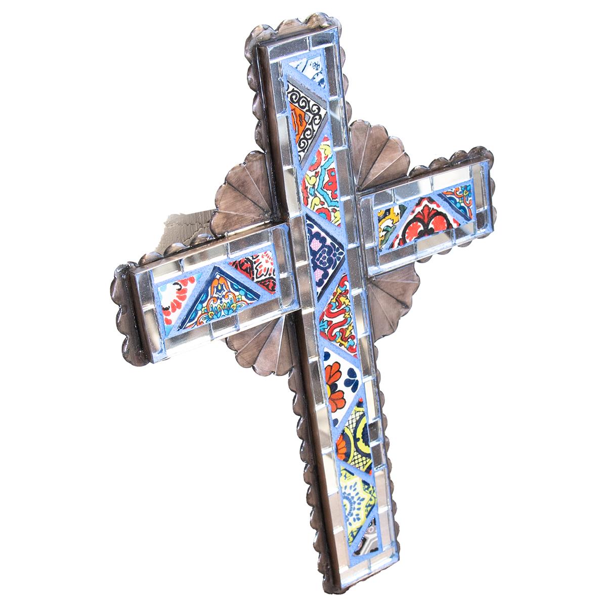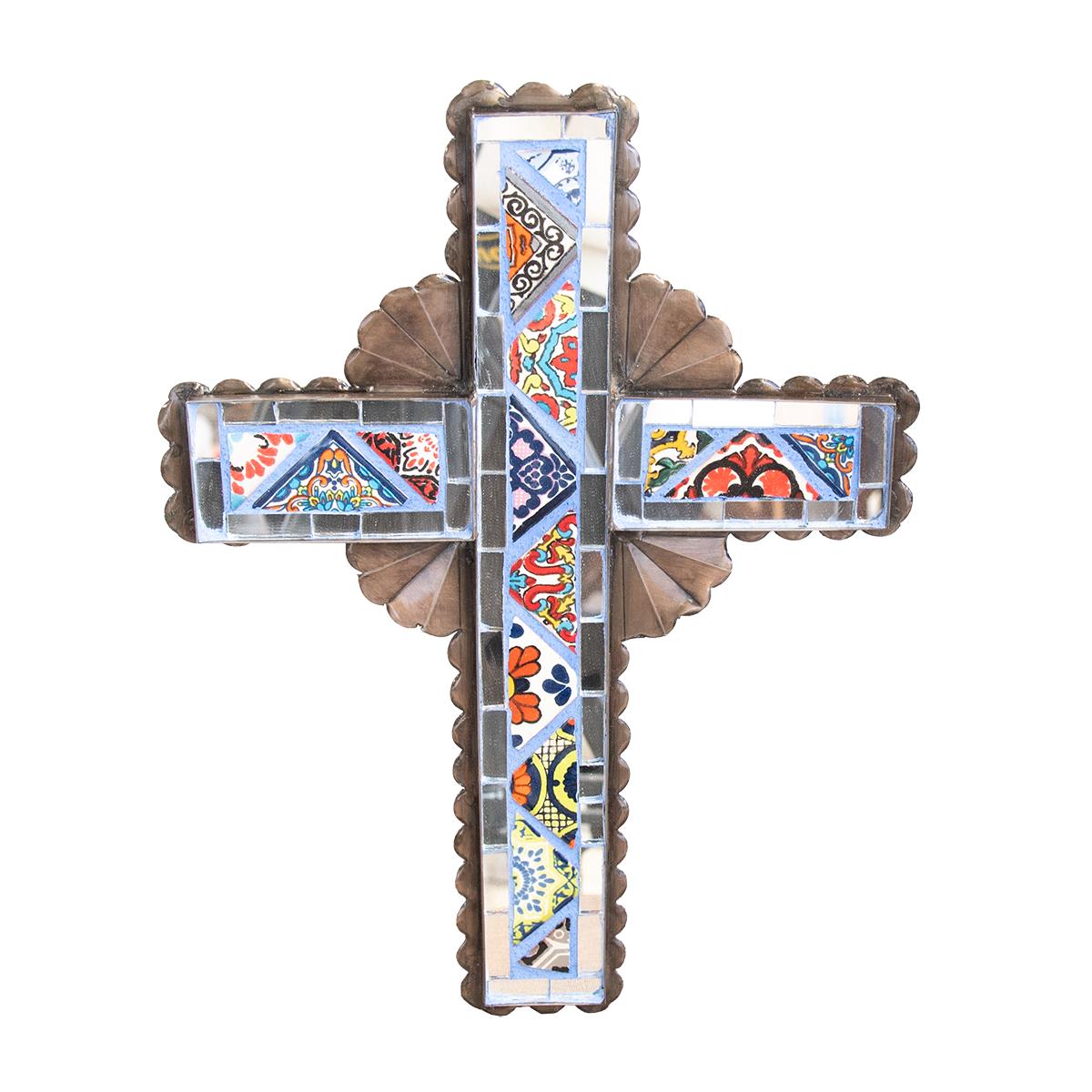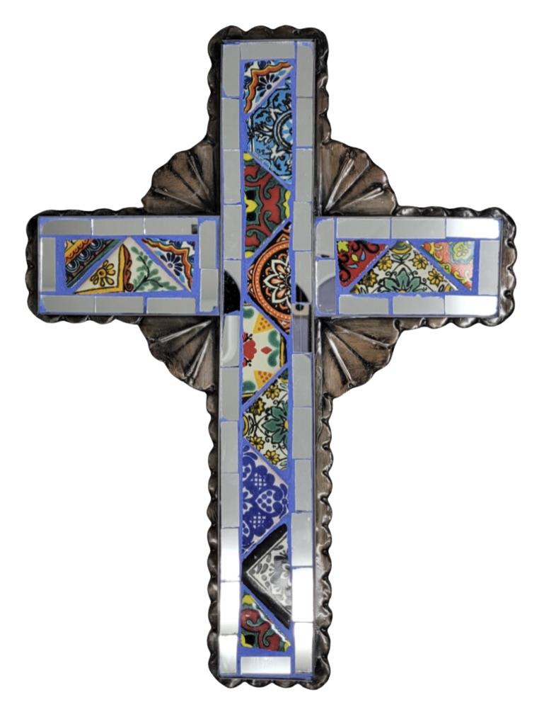 METAL CROSS WITH PATCHWORK TILE AND MIRROR