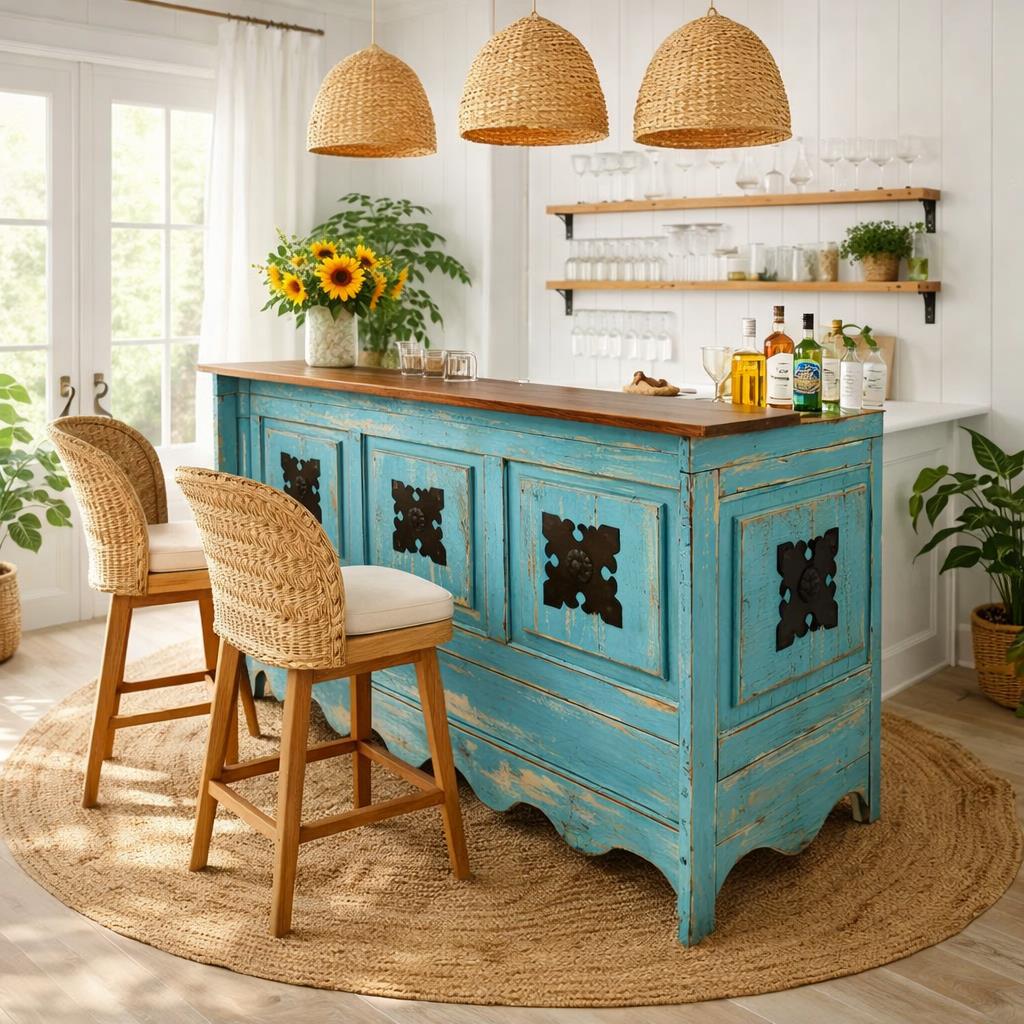 AGED RECLAIMED BAR WITH HAND FORGED STEEL ACCENTS - TURQUOISE WASH