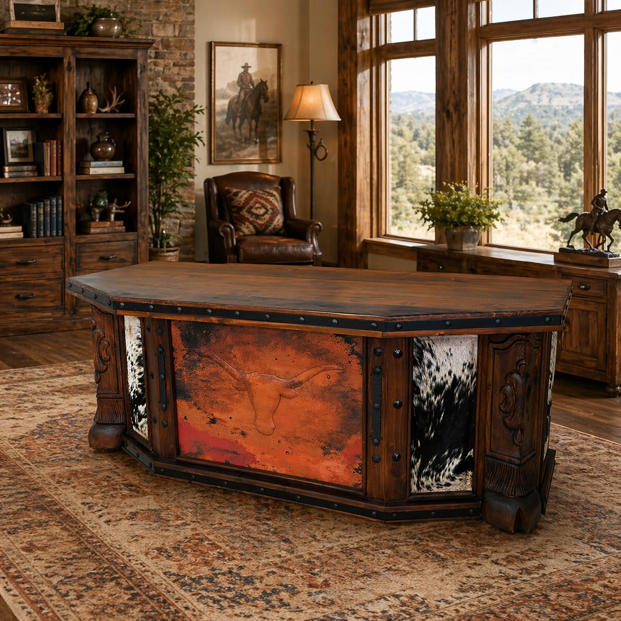 Badlands Executive Desk - Chilean pine 5-panel desk with copper embossed longhorn, copper and cowhide inserts, and stylized cow hoof supports 84" x 33" x 32"
