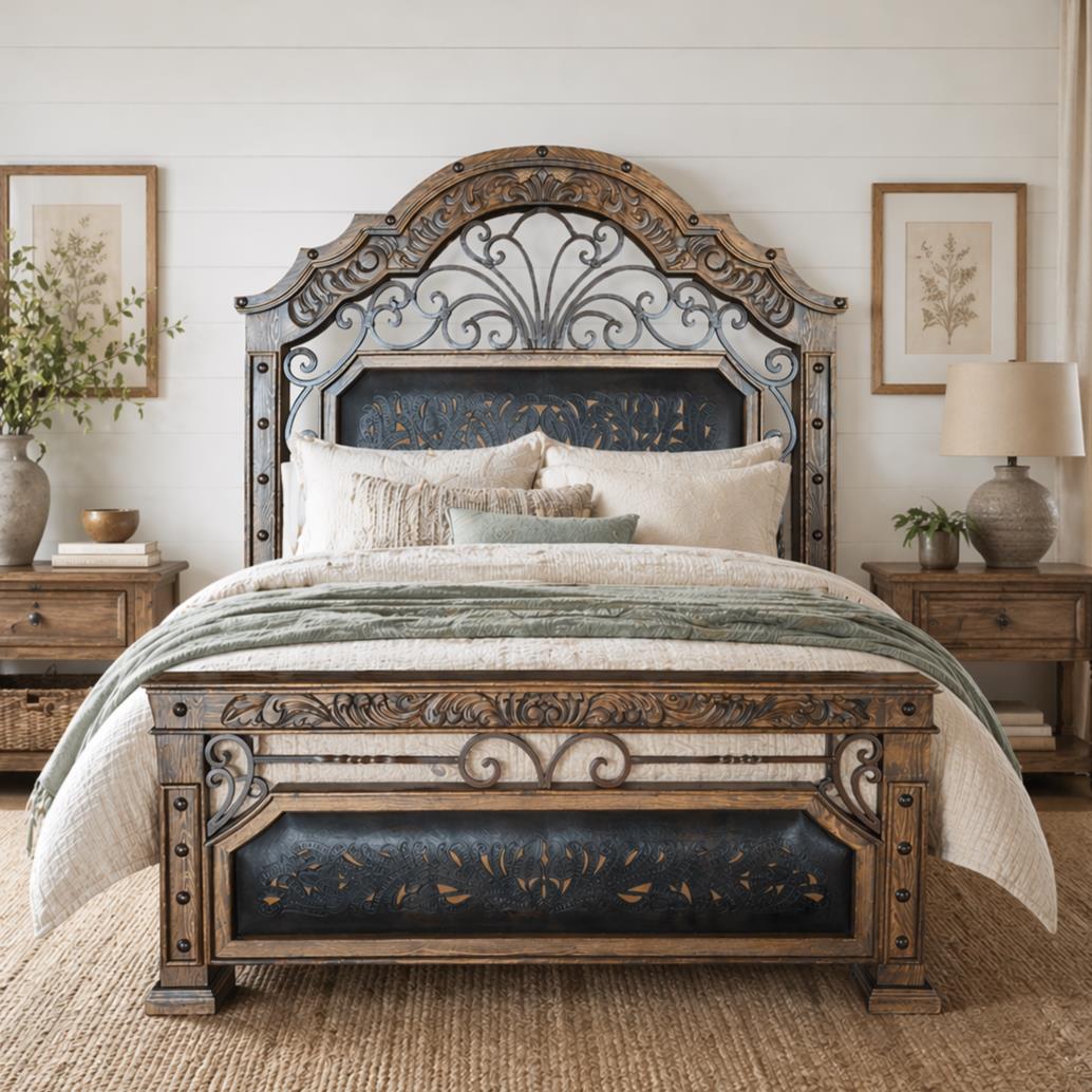 King Bed W/Tooled Leather & Iron